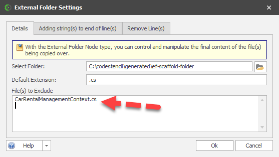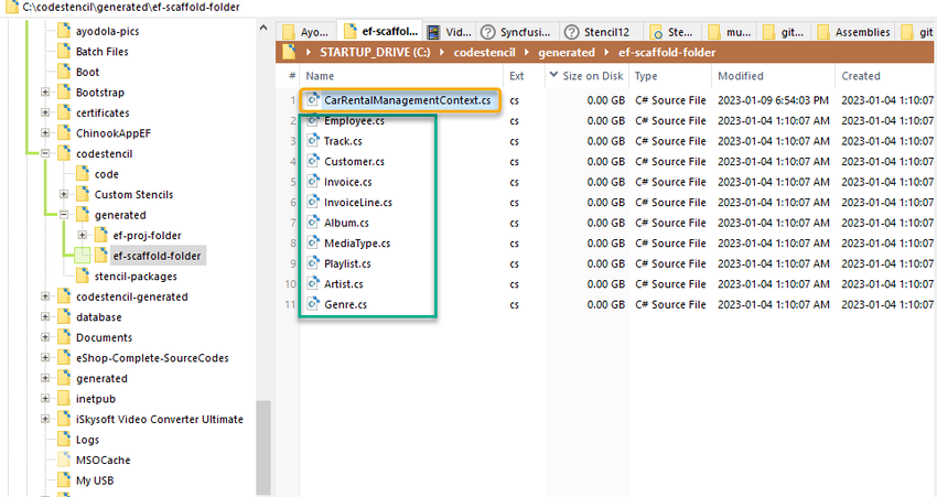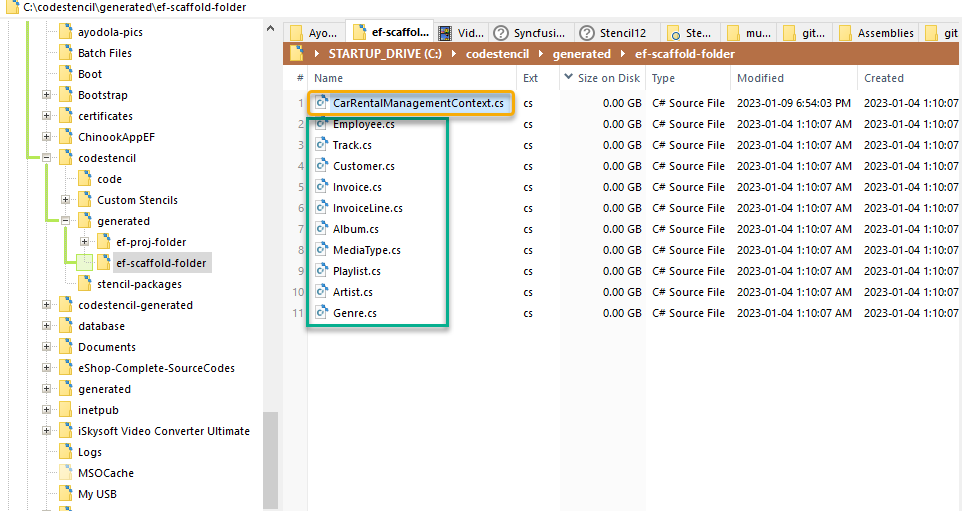 For example, in the screenshot below which shows files generated by the Entity Framework scaffolder, we want to copy only the POCO classes to the folder or node we are setting properties for. The reason for this is that the DBContext class - CarRentalManagementContext.cs need to be copied to a different folder.